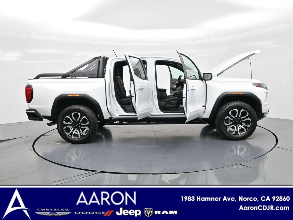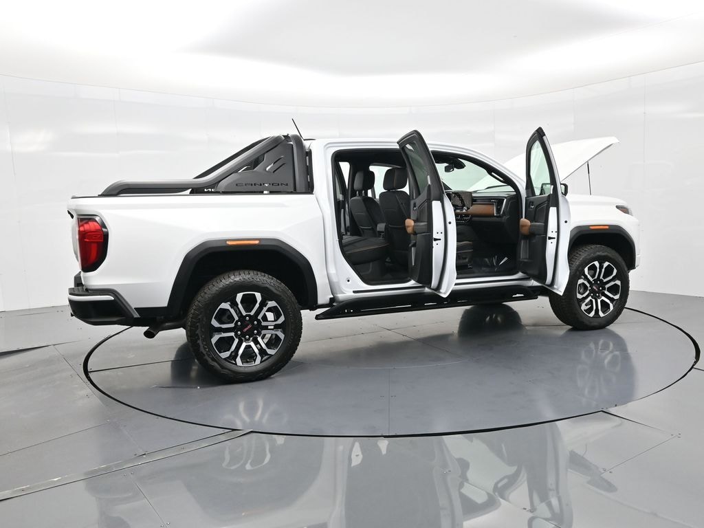 Purpose-built for work and weekends: TurboMax 2.7L I4 (310 hp/430 lb-ft) and 8-speed automatic, Off-Road suspension, drive modes for Normal/Off-Road/Terrain/Tow-Haul, hill descent control, 20x9 aluminum wheels on 275/60R20 tires, bed tubular sport bar, 120-volt bed outlet, integrated trailer brake controller, heated and ventilated front seats, heated wheel, wireless charging, remote start, and Canyon Pro Safety with blind zone steering assist with trailering, rear cross traffic braking, lane keep assist, forward collision alert, and front pedestrian and bicyclist braking.