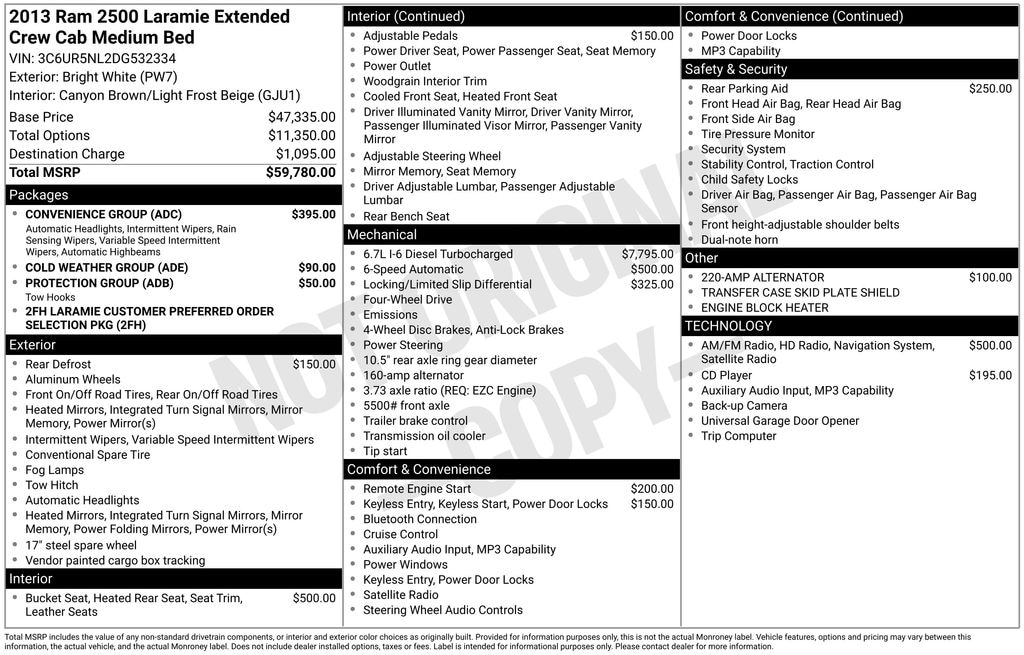 This Ram 2500 Laramie is priced at $32,820 and is ready to take on any challenge. With its exceptional features, robust powertrain, and premium appointments, it represents an exceptional value in the heavy-duty truck market. We invite you to schedule a test drive and see for yourself why this 2013 Ram 2500 Laramie is the perfect choice for your next vehicle.